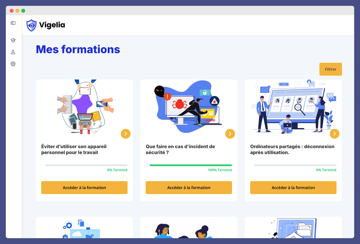 Try Vigelia with no obligation with our introductory cybersecurity module. Create your account and get immediate access to your first free course.