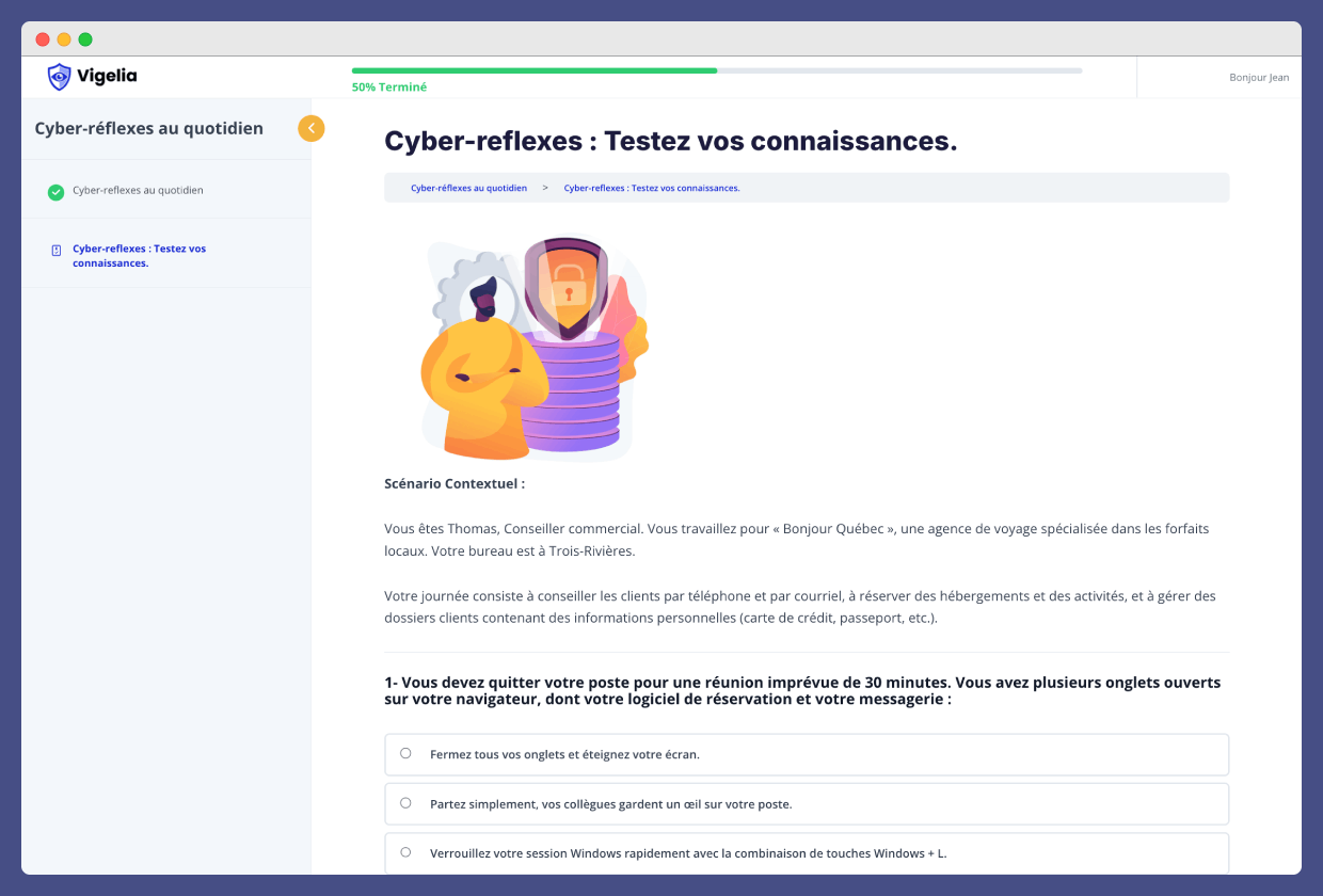 “As a law student, cybersecurity seemed beyond my field of expertise. Thanks to Vigelia, I discovered a fun and accessible training program! The videos are clear and the interactive quizzes are really engaging.”